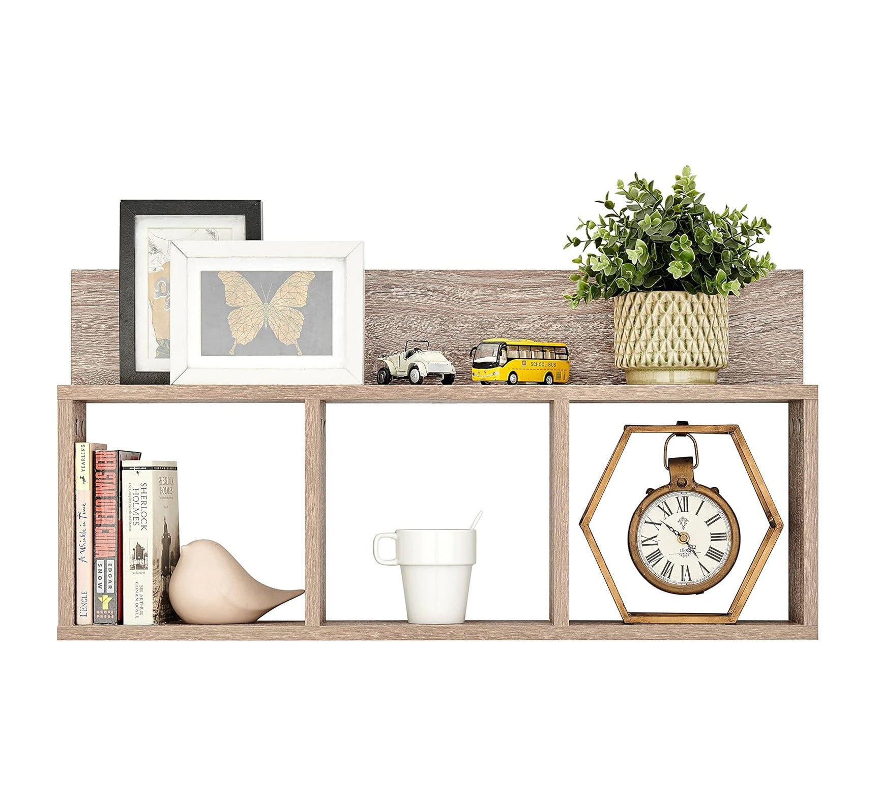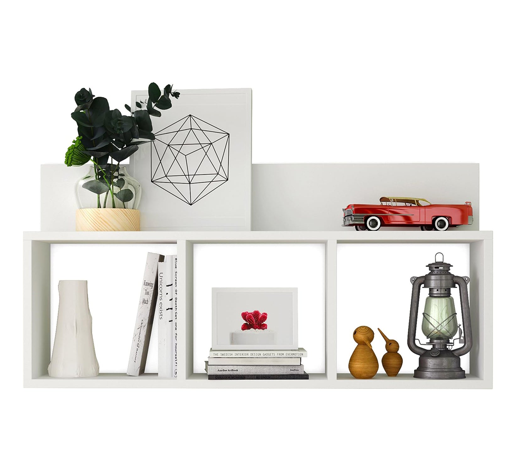Apportez une touche contemporaine à votre décoration intérieure avec cette étagère murale triple associant trois cubes de rangement ouverts et une tablette d’affichage sur le dessus — idéale pour organiser et valoriser vos objets décoratifs, livres ou plantes.